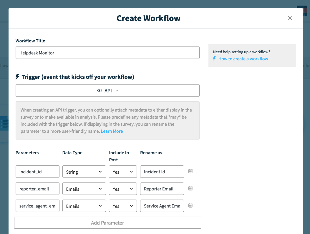 By selecting the API trigger, you'll need to call into the Polly API to trigger the workflow every time a ticket has been closed from your ticketing system, with the data that you send in the URL.