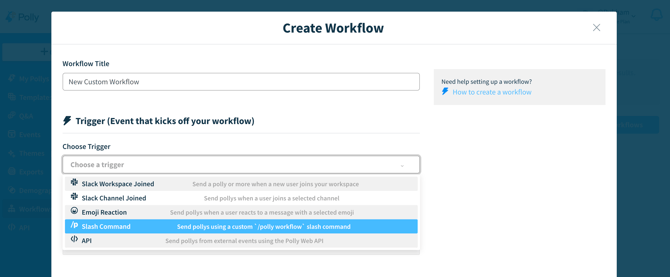 💡 Tip: After running the slash command in the desired channel and selecting a workflow from the dropdown, you can enable a previously disabled workflow directly from Slack without returning to the Polly dashboard.