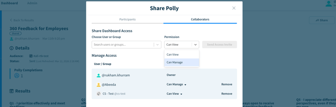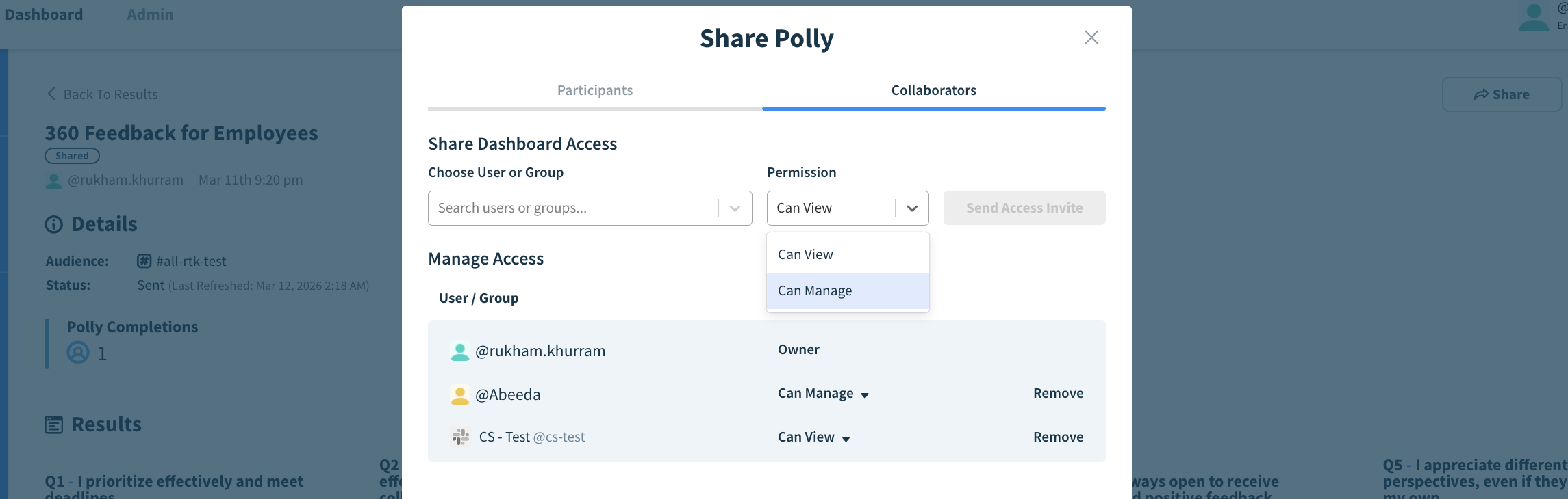 Once a Slack user group is added as a collaborator, all members of that group automatically receive the assigned permissions, allowing them to view results or manage the Polly depending on the access level selected.