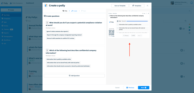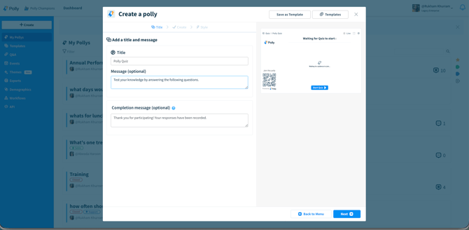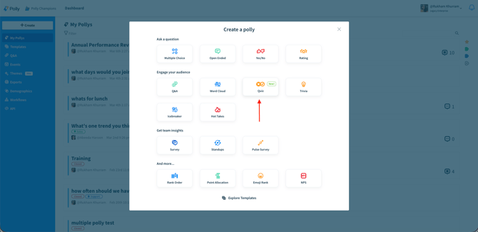 Quizzes are created from the Polly web dashboard and can be built either from scratch or using one of the available templates.