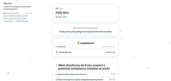 If the leaderboard feature is enabled, participants will also see a ranking of quiz scores based on their performance.