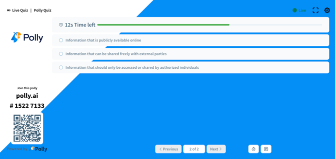 Participants can join using a QR code or join code displayed on the presentation screen, or through the web voting link. Once participants have joined, the presenter can start the quiz and advance through questions as the session progresses.