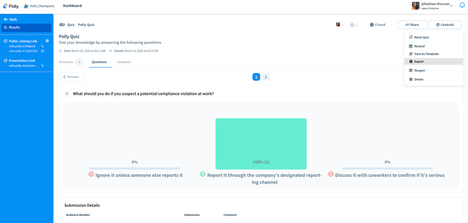 Once the quiz has finished, detailed results are available from the Polly web dashboard.