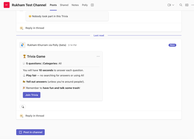 Once trivia is posted in the channel, click Join Trivia to participate.