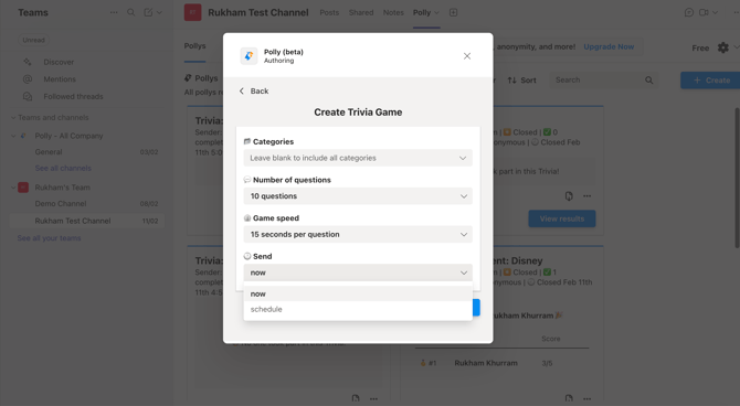 4. Choose to send immediately or schedule the trivia for a later date and time.