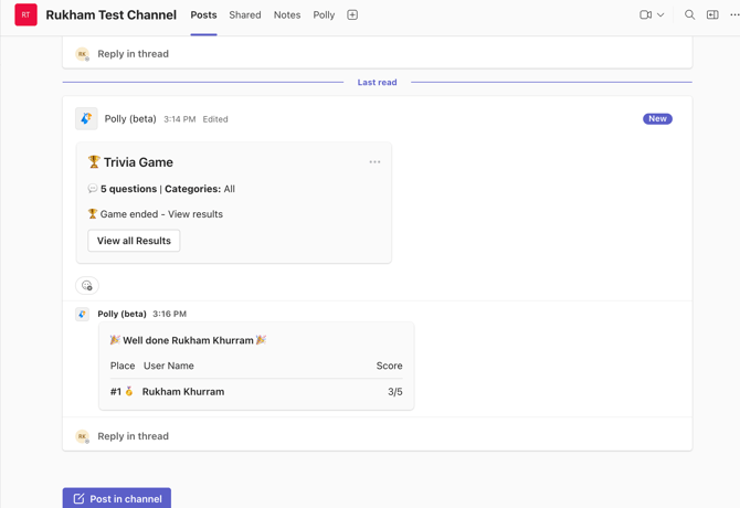 Use Delete to permanently remove the trivia from the channel or meeting chat.